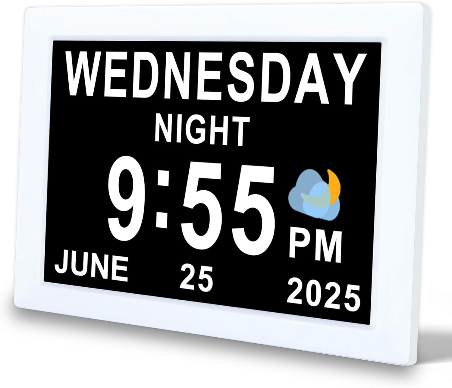 આકૃતિ 1: આગળ view of the TMC 8-Inch Digital Clock, showing a clear display of the day, time, and date.
